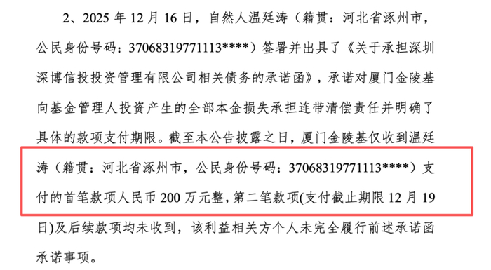 除上市公司外,还有一个大冤种,就是公告里的温廷涛,一个跟私募公司无关紧要的自然人出来说要承担损失,然后先给上市公司打了200万。