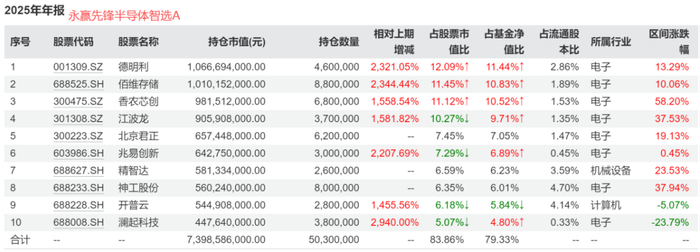 排在榜首的是张海啸管理的永赢先锋半导体智选混合发起A(025208.OF),听名字就知道,这只基金专注在半导体赛道,四季报显示其持仓主要聚焦在芯片领域。
