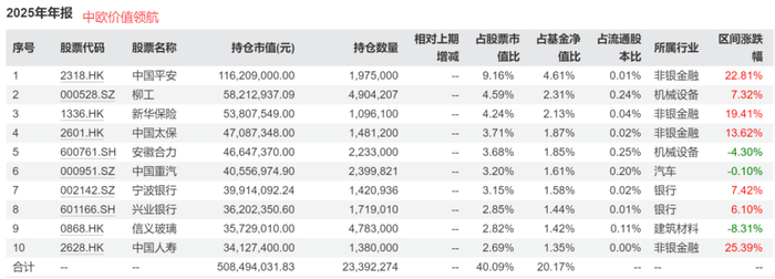 另一未在榜单但也出现吸金特质的是中欧价值领航(024427.OF),由基金经理蓝小康管理,该基金成立于去年10月份,截至去年底合并规模超25亿元。