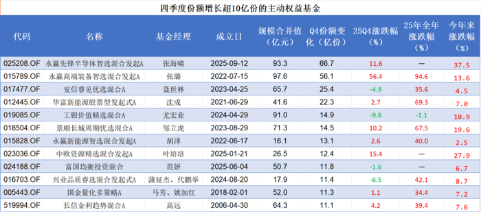 根据Choice数据统计,2025年四季度,共有12只主动权益基金份额增长超过10亿份。注:基金需成立于2025年9月30日之前。