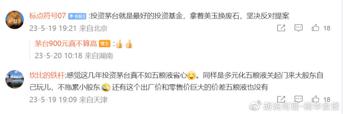 “感觉这几年投资茅台真不如五粮液省心。同样是多元化五粮液关起门来大股东自己玩儿,不拖累小股东, 还有这个出厂价和零售价巨大的价差五粮液也没有”。