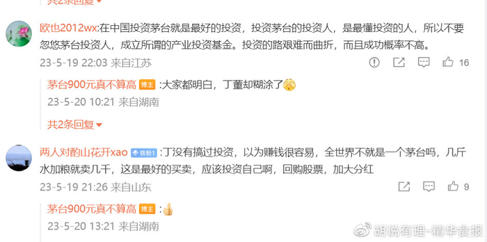 但是丁雄军的一番讲解依然遭到不少茅台小股东的反对。胡说有理注意到,此前曾因公开实名举报贵州茅台捐赠违规、茅台与习酒同业竞争而一战成名的贵州茅台股东“茅台900元真不算高”(网名)就是诸多反对者中的一员,该茅台股东通过微博公开质疑并反对此事,他直接表示“丁雄军董事长偏离主业,剑走偏锋,投资设立产业基金是舍本求末,放大风险!”,并给出“五星差评”的表述。