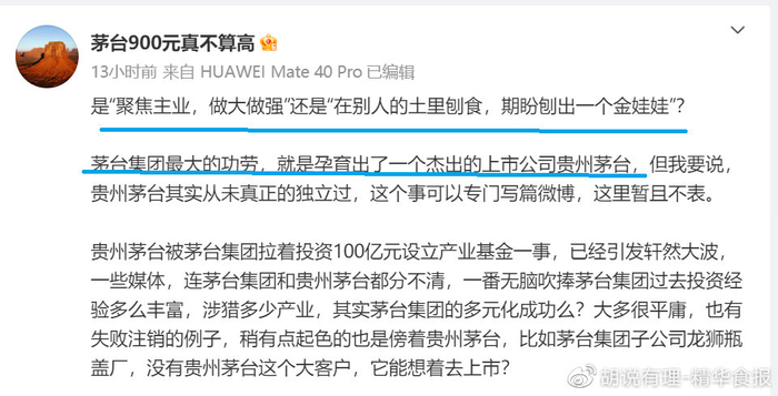 而知名茅台中小股东代表“茅台900元真不算高”(网名)更是公开对贵州贵州茅台董事长丁雄军此举给出“五星差评”,称其“偏离主业,剑走偏锋,投资设立产业基金是舍本求末,放大风险!”