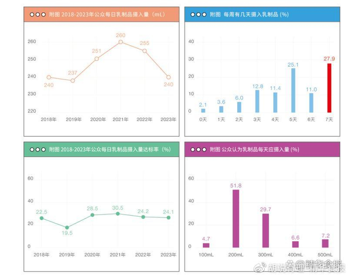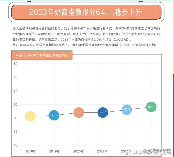 胡说有理还特别注意到,中国奶商指数报告于2018年首次发布,这期间公众平均每日摄入量在疫情三年期间达到一个高峰,但在2023年又回到了该项调查2018年的原点。