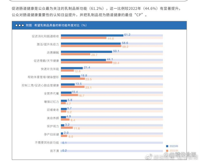报告显示,公众最为关注的乳制品新功能排在第一位的是“促进肠道健康”(61.2%),这一比例较2022年(44.6%)有显著提升。