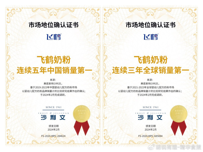 据了解,于2024年2月完成市场调研的弗若斯特沙利文向飞鹤颁发的认证证书信息显示:2019年-2023年度,飞鹤奶粉在中国婴幼儿配方奶粉市场(不含港澳台地区)连续5年位居第一;在全球婴幼儿配方奶粉市场连续3年销量第一。同时,旗下星飞帆系列早已成为婴儿奶粉品类全球第一大单品。