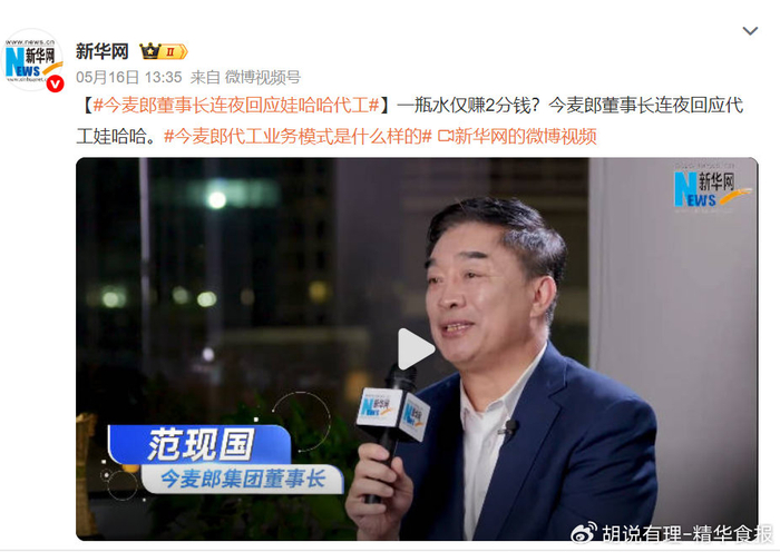 于是乎,5月16日下午13:35分,新华网发布标题为《今麦郎董事长连夜回应代工娃哈哈》的视频。“连夜回应”直到5月16日下午才对外发布,估计这个过程中也是经过了认真细致推敲审核剪辑,不容出现任何一点纰漏。