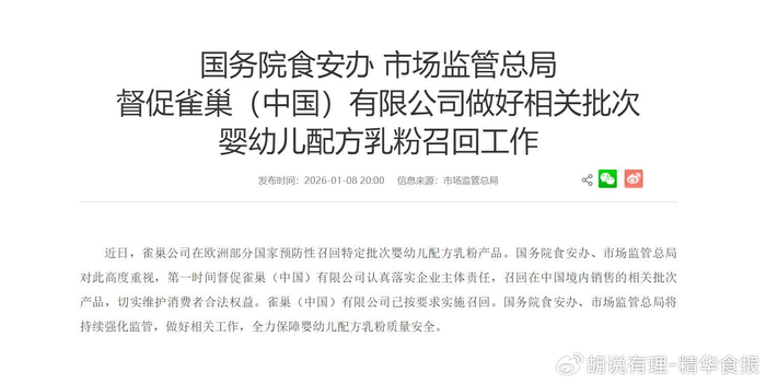 1月8日,国家市场监管总局发布消息,近日,雀巢公司在欧洲部分国家预防性召回特定批次婴幼儿配方乳粉产品。国务院食安办、市场监管总局对此高度重视,第一时间督促雀巢(中国)有限公司认真落实企业主体责任,召回在中国境内销售的相关批次产品,切实维护消费者合法权益。雀巢(中国)有限公司已按要求实施召回。国务院食安办、市场监管总局将持续强化监管,做好相关工作,全力保障婴幼儿配方乳粉质量安全。