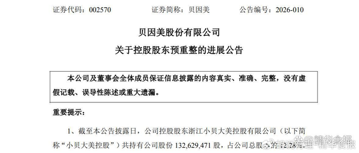 1月26日晚,贝因美(002570.SZ)发布公告,其控股股东浙江小贝大美控股有限公司向法院提出的预重整申请迎来进展,浙江省金华市中级人民法院已裁定受理小贝大美控股前期提出的预重整申请,其第一次债权人会议尚在表决过程中。
