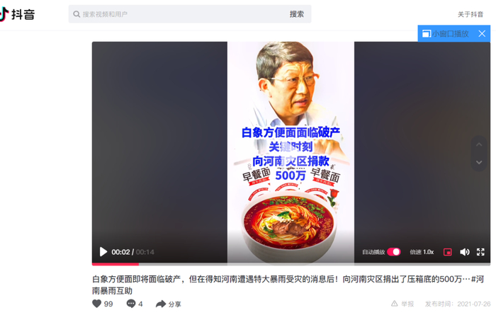 胡说有理注意到,显示有50多万粉丝的抖音号“情感清风”于7月26日发布信息称:“白象方便面即将面临破产,但在得知河南遭遇特大暴雨受灾的消息后,向河南灾区捐出了压箱底的500万”;该抖音号甚至还贴出了白象创始人姚忠良的照片。