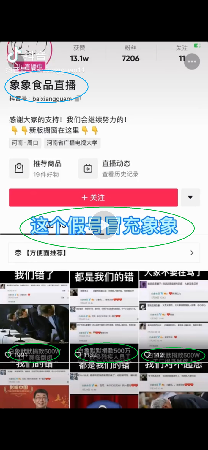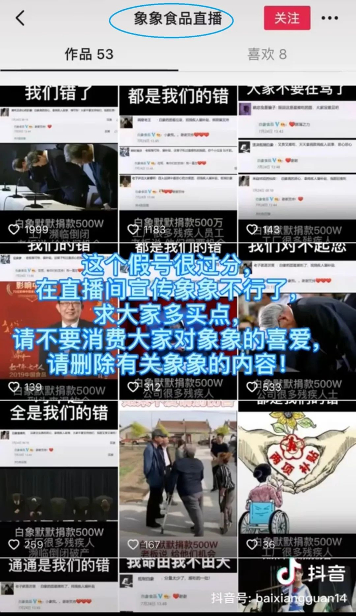 类似这样的说法并非个例,“白象经营困难”、“白象不行了”的传言在网络到处传播;甚至还有一家名为“象象食品直播”的账号,看上去就像是白象自己的官方直播间,因为白象品牌官方对自己的昵称就是“象象”。此前胡说有理点到该直播间主页发现,其近期发布了大量白象经营困难依然捐款500万、是国内方便面行业唯一拒绝日资入股的企业等煽情性内容,然后主播在直播间中反复强调白象经营特别困难,说“白象不行了,求大家多买点”。