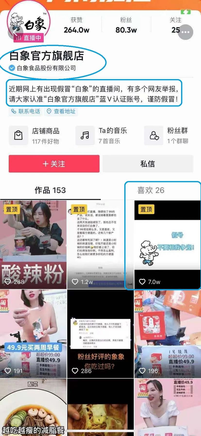 有意思的是,胡说有理昨天打开抖音却发现,上述“象象食品直播”直播号已经找不到了。而胡说有理在抖音号“白象官方旗舰店”里发现,其置顶了一则视频,该视频直接指称,“象象食品直播”是冒充“象象”的假号,而自己才是“象象”正宗蓝v官方认证的企业号。视频直接指出:“这个假号很过分,在直播间宣传象象不行了,求大家多买点”。