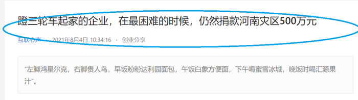 还有网络传言称:“蹬三轮起家的企业,在最困难的时候,仍然捐款河南灾区500万元”。