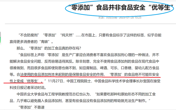 《科技日报》报道援引中国工程院院士、中国食品科学学会理事长孙宝国以及中国农业大学食品与工程学院教授范志红等专家的观点,直接指出:“零添加”食品并非食品安全“优等生”。