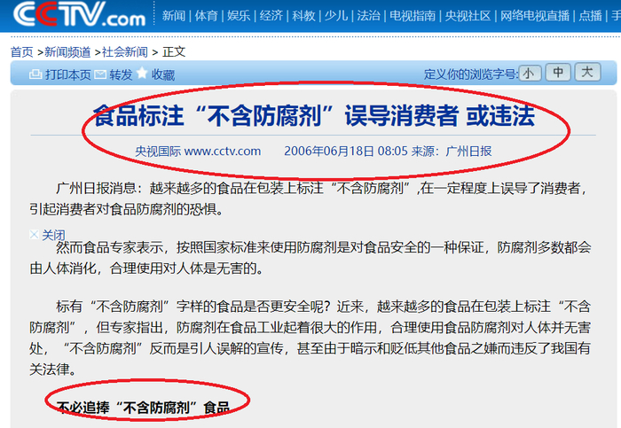 同样是2006年,《广州日报》的《食品标注“不含防腐剂”误导消费者 或违法》稿件中指出,不必追捧“不含防腐剂”食品。