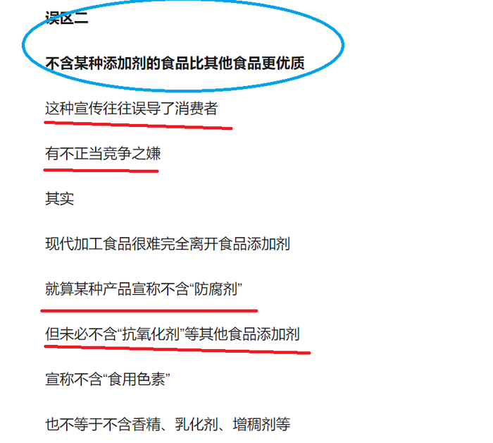 来自《央视一套》今年年初的报道显示:关于食品添加剂有很多误区,报道提到的其中一个误区就是:“不含某种添加剂的食品比其他食品更优质”,其实现代加工食品很难完全离开食品添加剂,就算某种产品宣称不含“防腐剂”,但未必不含“抗氧化剂”等其他食品添加剂。