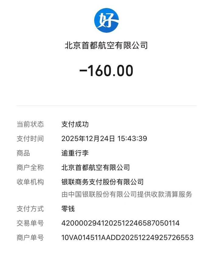 我从三亚坐到南京的机票钱是五百出头,160元的行李逾重费用,快赶上机票价格的三分之一了,这种收费明显不符合比例嘛。仅仅逾重一点点,就把乘客往死里薅,首都航空,你的吃相还能再难看点吗?
