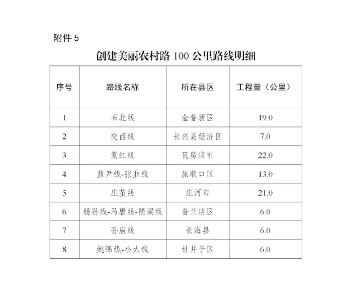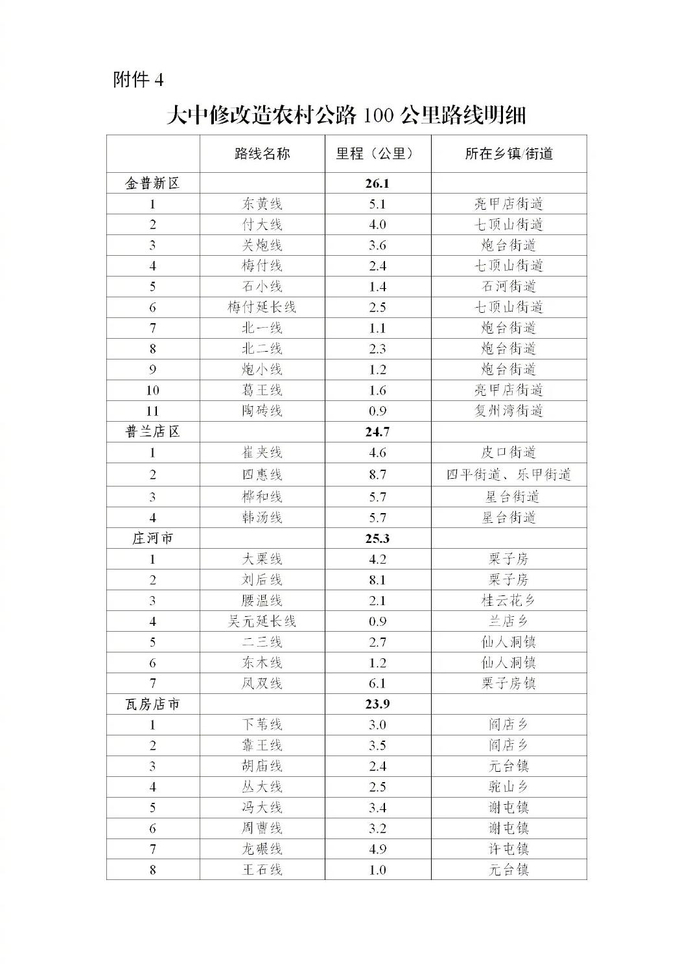 实施大中修农村公路100公里(详见附件4),有效提高路面平整度和结构承载力,优化完善公路安全设施,大幅提升农村公路行车舒适度和安全性。(责任单位:市交通运输局、市财政局,普兰店区政府、瓦房店市政府、庄河市政府、金普新区管委会)