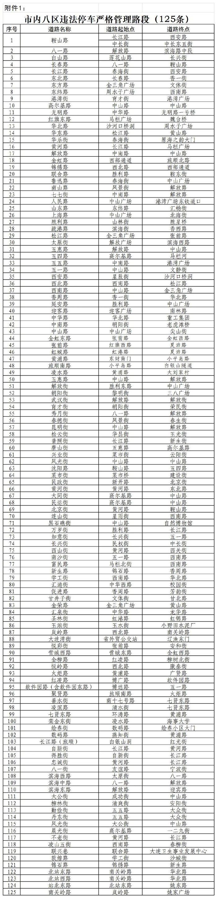 开展125条严管路段(详见附件1)乱停乱放综合整治,消除道路内“起二排、堵路口、占通道”等各类违法停车行为。将中山区凯丹广场、西岗区奥林匹克广场、沙河口区和平广场、甘井子区梭鱼湾杉杉奥莱、高新区万达广场5个商圈作为试点,合理设置临时停车区域,通过强化违停执法,督促车主进场停车、按位停车,有效规范商圈停车秩序。(责任单位:市公安局、市城市管理局、市住房城乡建设局,相关区市县政府、先导区管委会)