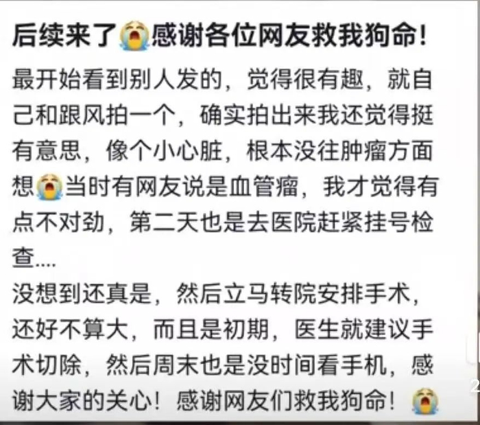 没想到照片发布后,有眼尖的网友提醒她这可能是血管瘤。第二天,她就去医院检查,确诊为血管瘤,医生建议手术切除,“还好不算大,而且是初期!”随后,该女生发文“感谢网友救命”。