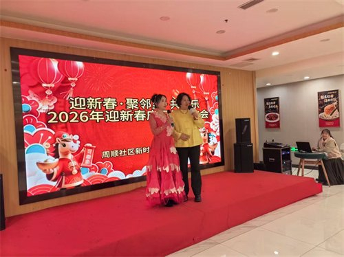 近日,周水子街道周顺社区新时代文明实践站在辖区双盛园热闹举办“迎新春聚邻里共欢乐”2026迎新年联欢会,这场由居民全程自编自导自演的文化盛宴,让邻里们在欢声笑语中喜迎新春。