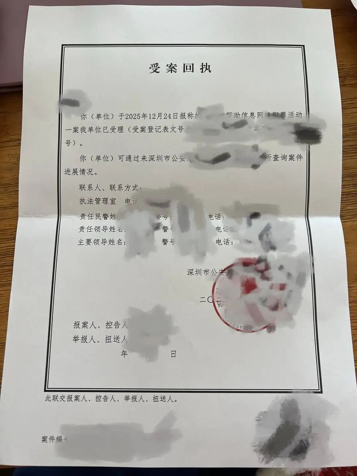 深圳蛇口港派出所受理此案并出具报案回执。但警方表示,此类诈骗多为团伙作案,资金转移迅速,追回难度极大。博主目前已联系银行冻结账户、办理销卡,并计划重新办理身份证。