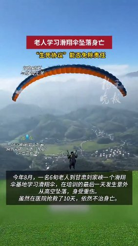 今年8月,一名六旬男子到甘肃刘家峡一个滑翔伞基地学习滑翔伞,在培训的最后一天发生意外从高空坠落,身受重伤。在医院抢救了10天后,他不治身亡。