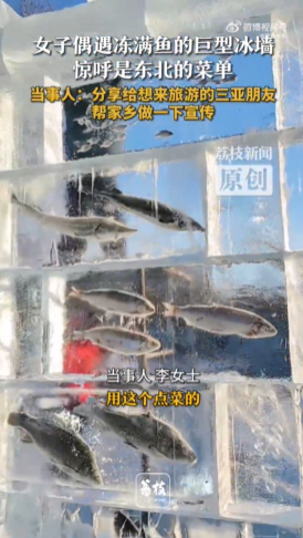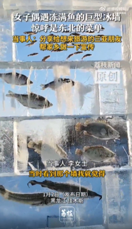 李女士称,看到一面巨型冰墙,里面全都是鱼,好像点菜用的。有一个三亚的朋友,他最近想来东北旅游,就想让他们知道东北人是用这个点菜的,还能帮家乡做一下宣传。