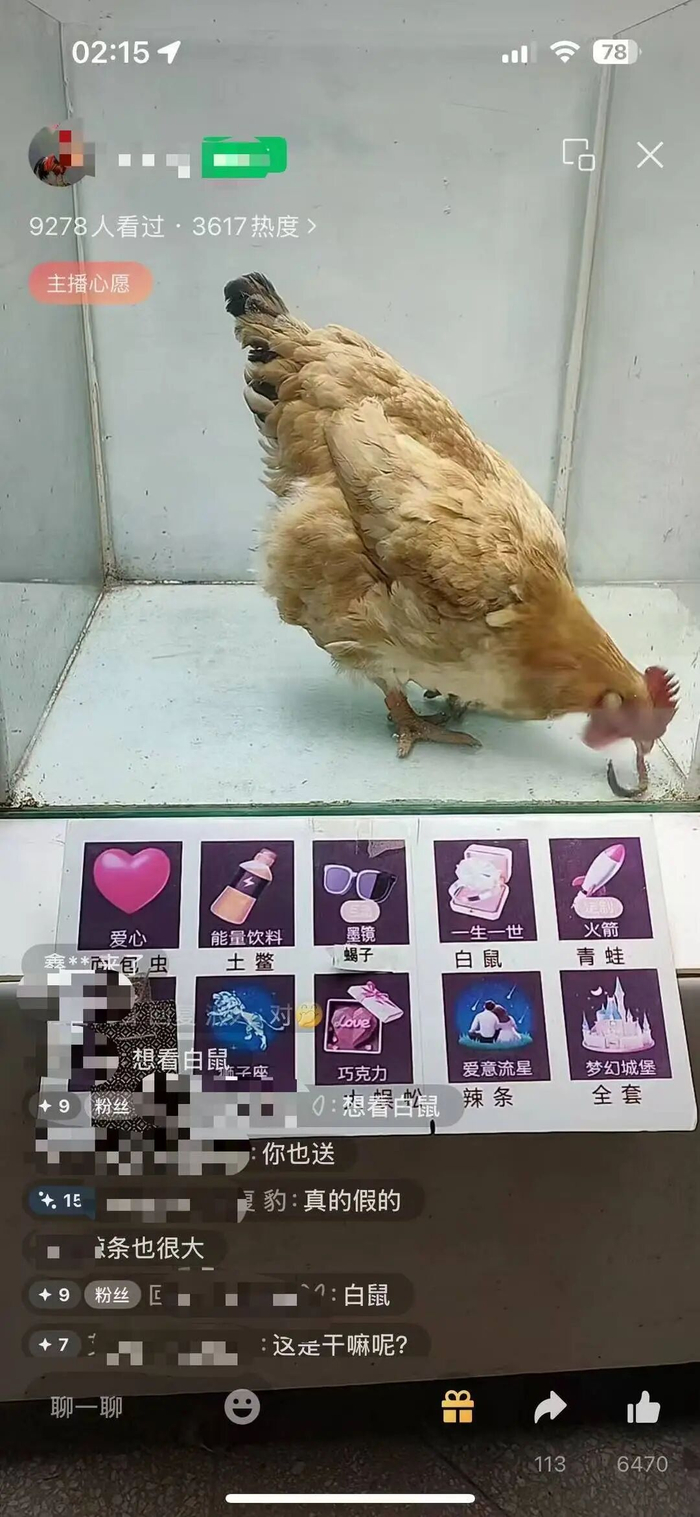 直播过程中,礼物与投喂行为实时联动——每当观众送出对应打赏,便有一只来自镜头外的手将活体生物投入笼中,鸡被迫在有限空间内不断啄食,直至“礼物环节”结束。直播持续数小时,弹幕中不时出现“吃老鼠”“喂青蛙”等催促内容。