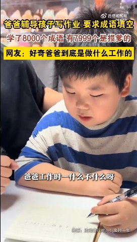 1月7日(发布时间),北京一位爸爸辅导孩子写作业的日常,直接把网友给笑翻了。当天,爸爸让孩子用 “一 X 不 X” 格式的成语填空造句,本想检验娃的学习成果,没想到孩子张口全是 “暴击”:“爸爸工作一分不挣”“爸爸工作一丝不挂”“爸爸工作一动不动”。一连串 “损爹” 造句,不仅把爸爸听得目瞪口呆,还戳中网友笑点,大家纷纷调侃:求问爸爸到底是干啥工作的?