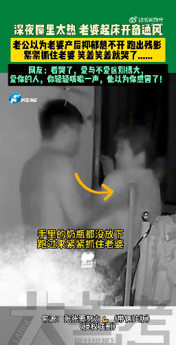 据@大参考1月9日报道,深夜屋里太热,天津一女子起床开窗通风,女子老公以为她产后抑郁想不开,手里的奶瓶都没顾上放下,就飞速跑过去紧紧抓住老婆,女子笑着笑着就抱着老公哭了......