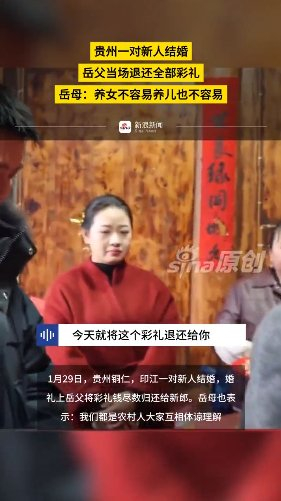 近日,贵州印江一对新人结婚,在婚礼现场女方父母将彩礼退还给男方,并送上祝福:“希望你们两个人以后相亲相爱,共度余生。”