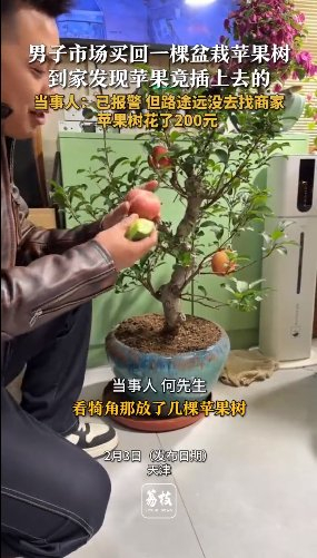 2月3日,天津一男子从市场买回一棵盆栽苹果树,到家发现树上的苹果根本不是自然生长的,而是被人工插上去的。