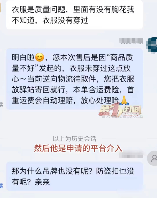 商家王女士告诉记者:我气得手都发抖了,而且那个时候我还不知道这个衣服已经签收了20多天,后来查订单看到签收了20天之后,我就更气了。这两天晚上都没睡好觉。这个衣服打开包裹,它是用菜市场那种塑料袋装的,第一没有吊牌,第二没有防盗扣标,这个衣服绝对是穿过的,(买家)对我们信息已读不回。到2月5日那天,说这个视频是我们伪造的,然后申请平台介入说商品质量有问题。(我)拒绝不了只能收回来,没有准备二次销售了。没为别的,就为争这口气,真的没有素质。