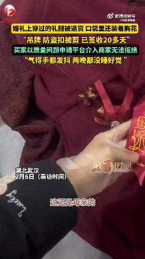 2月6日,湖北武汉一店家发布视频称买家婚礼上穿过的礼服被退货,“吊牌、防盗扣被剪,已经签收20多天”,买家以质量问题申请平台介入商家无法拒绝,把商家气得手发抖,两晚没睡好。