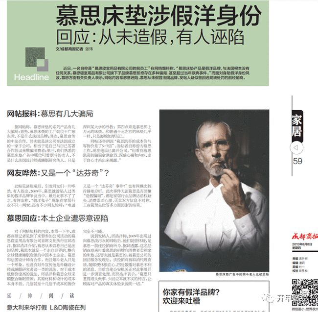 2011年,假洋品牌“达芬奇事件”给慕思公司极大的触动,公司再次进行了宣传调整。除了品牌形象中还是用一个叼烟斗的外国老人之外,慕思公司在所有对外宣传上不再吹嘘法国设计师的概念,也不再吹嘘法国血统。
