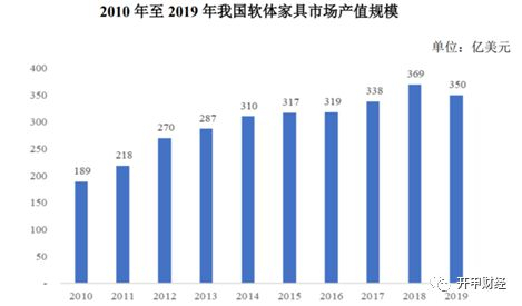 慕思股份主要产品床垫和床架属于软体家具。据CSIL统计数据显示,2010年至2019年,中国国软体家具总产值由189亿美元增长至350亿美元,年均复合增长率为7.05%。