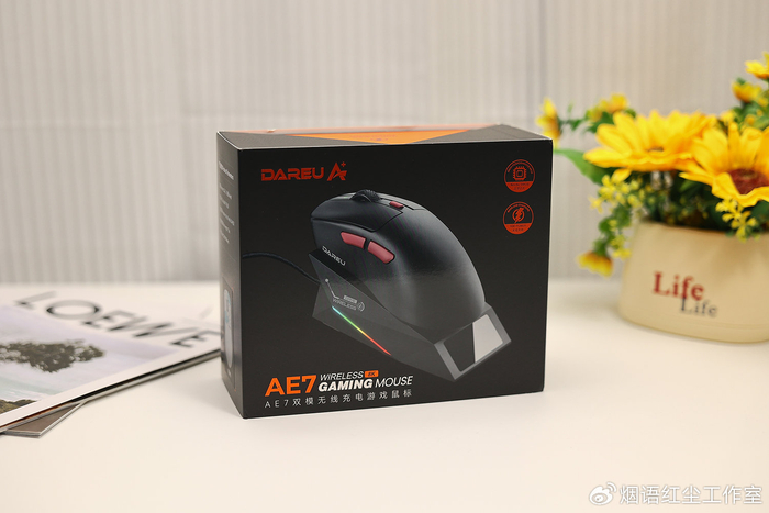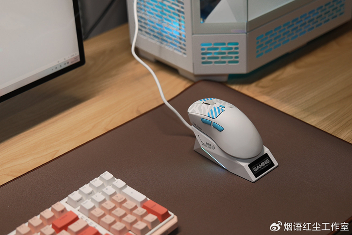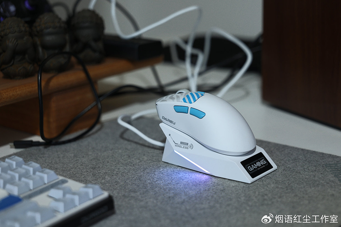 达尔优AE7的革新不止于鼠标本身,其标配的“飞艇无线充电底座”是一次对无线桌面体验的重新定义。传统无线鼠标的NANO接收器小巧易丢,信号覆盖范围有限,在复杂的多设备环境中容易受到干扰。AE7的创新之处在于,将2.4G接收器直接集成于充电底座内部。这种集成式设计带来了多重优势:首先,它彻底解决了接收器丢失或插拔不便的烦恼;其次,底座内置更大天线,显著扩大了信号覆盖范围并增强了抗干扰能力,即使在远离主机或多无线设备共存的复杂环境下,连接依然稳定如初。底座支持Qi无线充电协议,鼠标放上即充,充电效率高,约2小时即可充满。