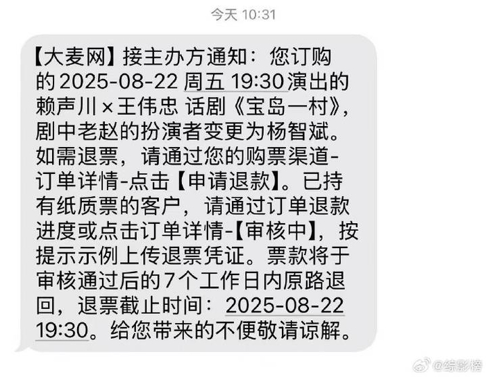 赖声川的回避与傲慢未能平息争议,反而让舆论怒火愈演愈烈。事件发酵十天后,市场开始显现其惩罚性后果:原定于8月29-30日在无锡大剧院上演的《宝岛一村》突然取消,官方未作详细说明,但观众普遍将其与涉毒演员争议关联。更具标志性的是北京场的临时换角——8月22日开演前,购票观众收到短信通知,屈中恒饰演的“老赵”改由仅出演过一场特别版的杨智斌替代,接受所有购票观众们的无理由退票。