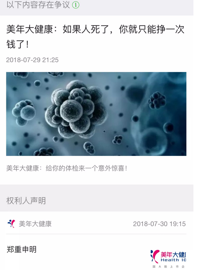 前有《疫苗之王》引发了大家对问题疫苗的滔天民意,长生生物因此一蹶不振,退市似乎已经是板上钉钉的事情;7月29日,一篇《美年大健康:如果人死了,你就只能挣一次钱了!》自媒体文章,让另外一家医药上市公司美年健康(002044.SZ)陷入舆论的泥淖。