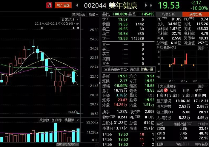 受周末自媒体爆料文影响,美年健康7月30日开盘即跌停,随后,有资金试图撬开跌停板,当即被大单砸平,以后一直保持跌停状态直到收盘,美年健康当日股价报19.53元/股,封单超过13万手,市值一日蒸发近68亿元。