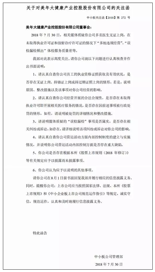 公说公有理,婆说婆有理,就在吃瓜围观群众分不清谁是谁非之际,7月30日晚间深交所下发关注函进行强势问询,要求美年健康认真自查公司员工的执业资格证照获取及有效状况,是否存在无证上岗、持错证上岗或持过期证照上岗的情形等。
