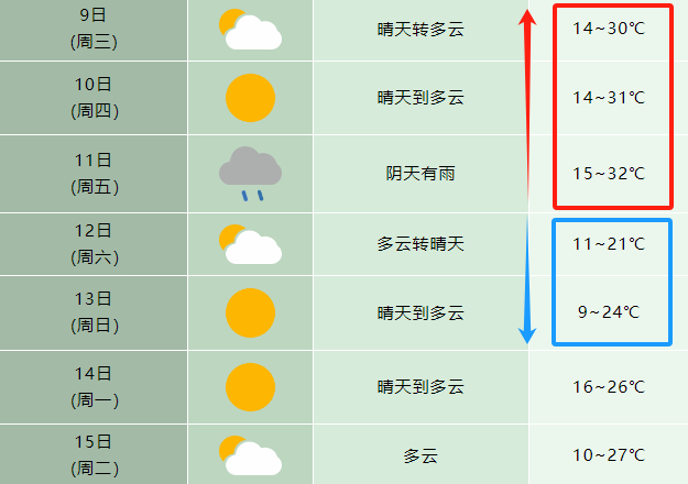 11日前我省大部分地区最高气温27℃以上,其中9-10日淮河以南和11日全省最高气温可达30℃以上。受冷空气影响,11日夜里至12日全省平均气温将下降10℃左右,12日全省最高气温仅13~16℃,同时11-12日全省平均风力增至4级左右,阵风8级以上。13日开始全省气温明显回升。