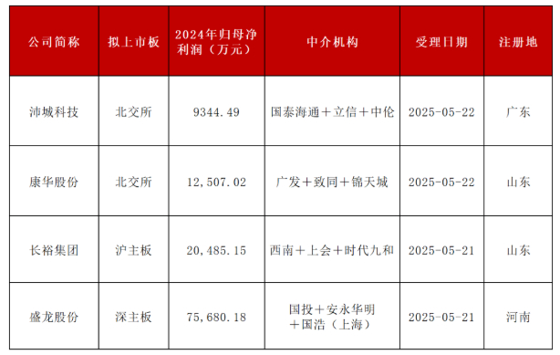沪主板IPO为长裕控股集团股份有限公司,深主板IPO为洛阳盛龙矿业集团股份有限公司,北交所IPO为深圳市沛城电子科技股份有限公司、山东康华生物医疗科技股份有限公司。打开投实App下载4家企业招股书。