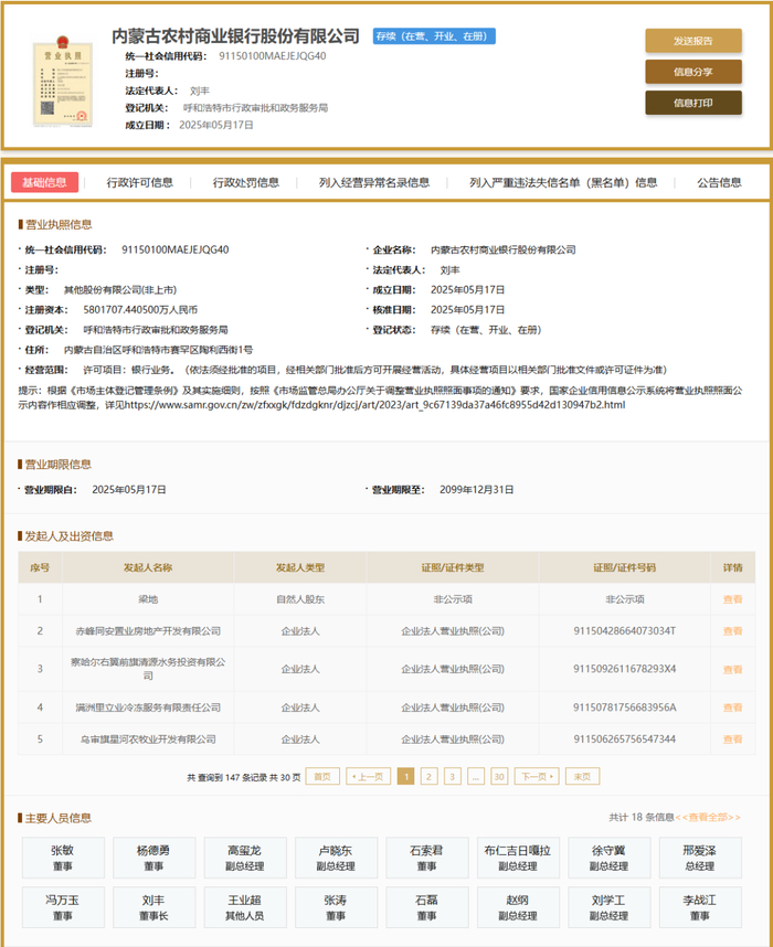 据国家企业信用信息公示系统显示,内蒙古农村商业银行股份有限公司已于5月17日成立,注册资本580.17亿元,法定代表人为该行党委书记、董事长刘丰。距3月14日国家金融监督管理总局发布批复同意筹建,仅过去两个多月时间。
