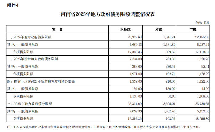 《财政部关于下达2025年新增地方政府债务限额的通知》(财预〔2025】31号)核定河南省2025年新增一般债务限额363亿元,年初预算已编列194亿元(省本级留用180亿元,待分14亿元),本次新增169亿元、上年结转8亿元(年初预算已编列,待分),可分配191亿元;