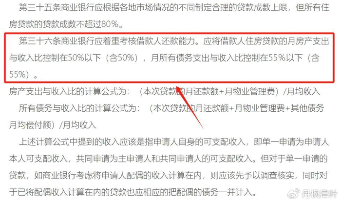 商业银行应着重考核借款人还款能力。应将借款人住房贷款的月房产支出与收入比控制在50%以下(含50%),月所有债务支出与收入比控制在55%以下(含55%)。