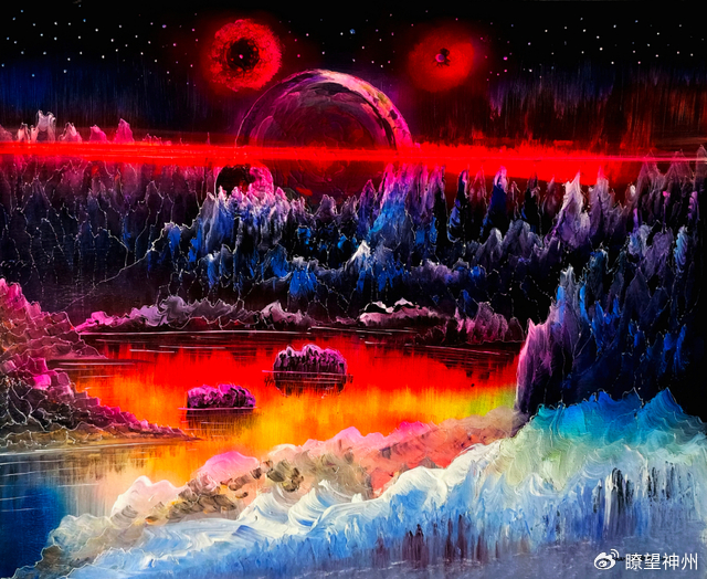 黄建南的创作过程,本身就是一段充满传奇色彩的表演。据现场目击者描述,他作画时仿佛被艺术的灵感所裹挟,双手各执一笔,在画布上肆意挥洒,颜料飞溅间却总能精准落于预定位置;时而退后凝神凝视,捕捉画面的细微瑕疵,时而疾步上前,挥毫补缀,整个过程如同一场精心编排的行为艺术,兼具力量与美感。更令人难以置信的是,他无需参考任何图像素材,仅凭脑海中的记忆与无穷想象,便能绘制出细节繁复、精准细腻的宇宙景观与自然奇观——这种能力,早已超越了普通画家的范畴,更接近一种与天地、宇宙对话的通灵之境。