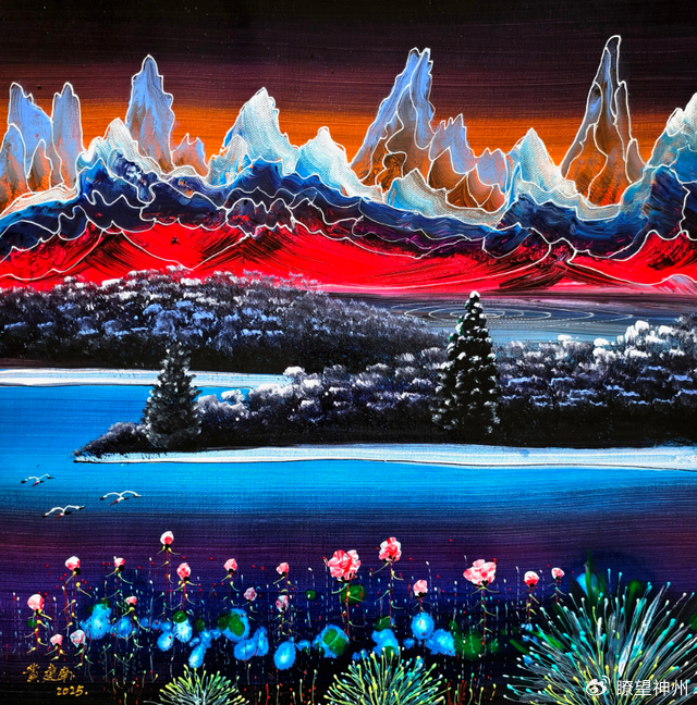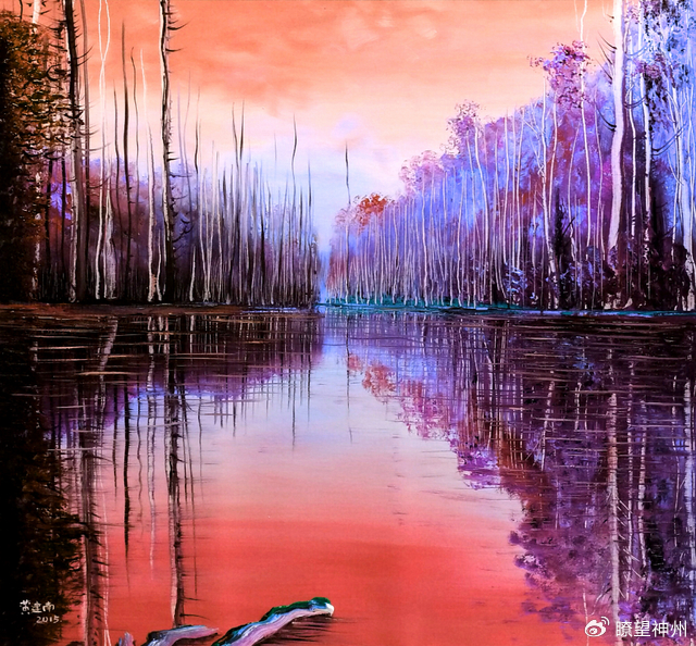 黄建南的艺术之路,本身就是一部兼具坚韧与浪漫的史诗。年轻时,他以近乎苦行僧般的执着,徒步三万八千里,踏遍中国大江南北:在原始森林的葱郁中聆听自然的私语,在荒漠戈壁的辽阔中仰望星空的深邃,在名山大川的灵秀中汲取生命的力量。这段非凡的修行,为他日后的创作沉淀下磅礴大气的精神底蕴,也积蓄了喷薄欲出的艺术能量——当他执起画笔,那些藏于生命深处的感悟与热爱,便如火山喷发般倾泻而出,化作一幅幅震撼心灵的视觉奇观。