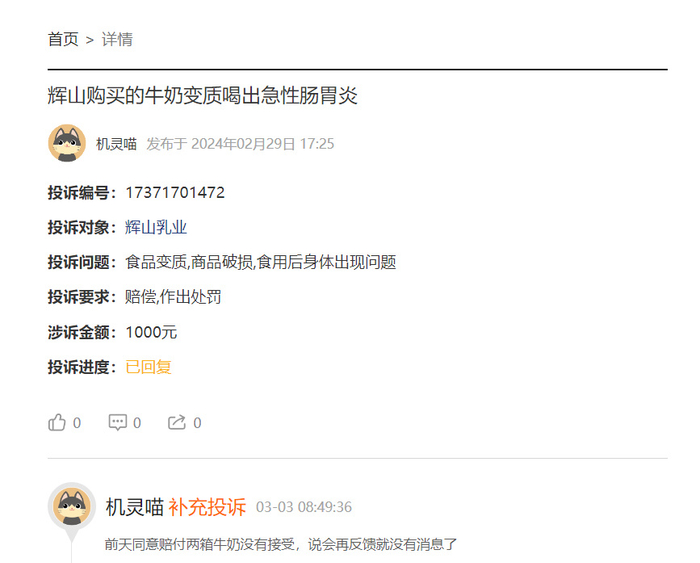 以该店销量最高的辉山纯牛奶为例,在评价中消费者频频提到该产品变质的问题,其中还有消费者投诉该类产品“缺斤少两”,明明自己拍的是24瓶,到手却只有13瓶,连包装也烂掉了。而在黑猫投诉[下载黑猫投诉客户端]平台,有不少消费者表示,在饮用辉山乳业的产品后,出现了身体不适的情况。